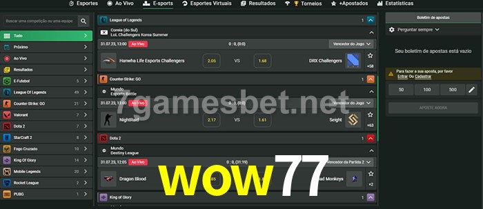 O wow77 oferece uma grande seleção de opções de apostas em e-sports com probabilidades competitivas